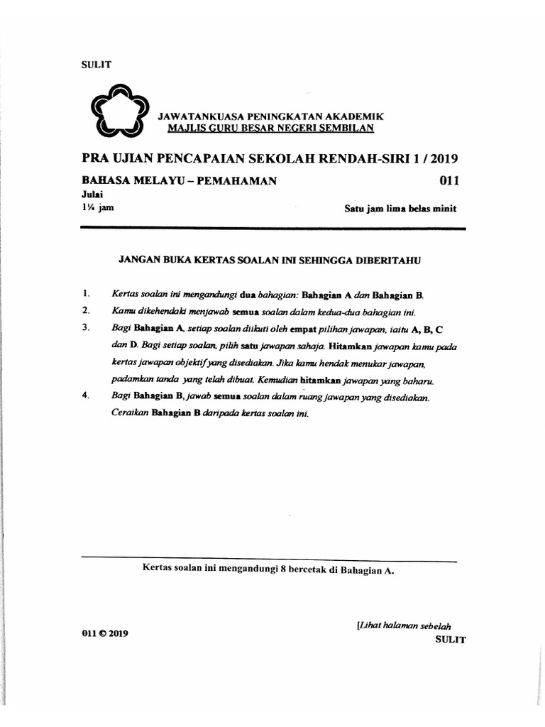 Soalan peperiksaan percubaan kerta bahasa melayu 2, mrsm 2019.