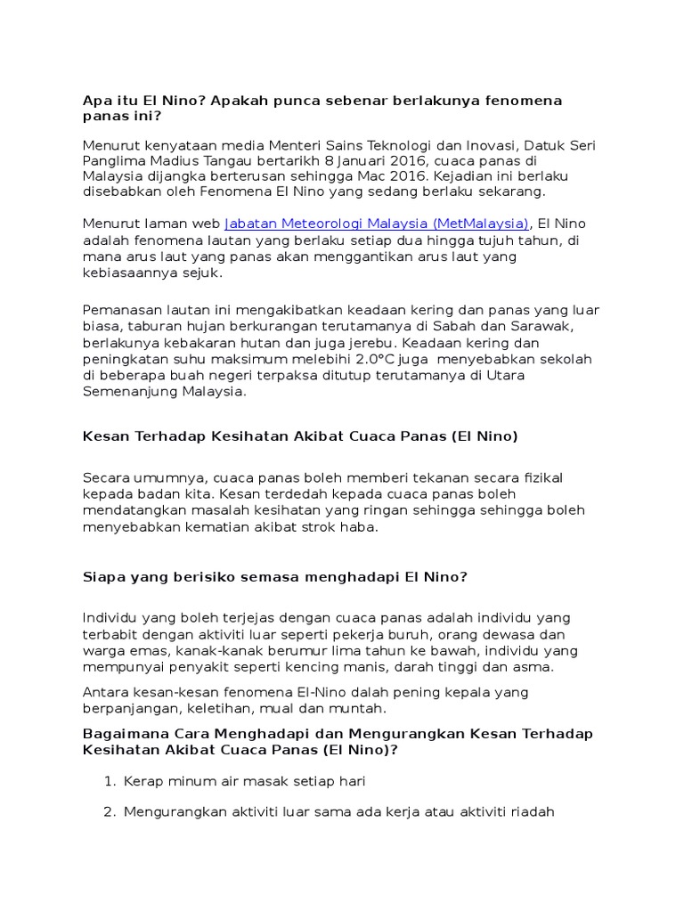 I like the women can chat whith me i'm here for you babe. Tropical malaysia has been baking under unusually hot weather even by its balmy standards as a result of the el nino weather phenomenon. Waktu itu keadaan cuaca sangat panas dan banyak berlakunya kebakaran hutan yang mengakibatkan jerebu yang teruk. Pejabat kaji cuaca united kingdom meramalkan kemungkinan besar fenomena el nino, yang mengakibatkan peningkatan suhu dan taburan hujan, akan melanda rantau. Hingga berita ini diturunkan, total viewersnya sudah mencapai angka 16 juta lebih. Dan belum lama ini, video prank nyamar jadi gembel milik nino sukses jadi trending nomor 1 di indonesia hingga malaysia loh. El nino menyebabkan musim kemarau dan berkurangnya curah hujan di indonesia. Lagu rohani talita doodo mp3. Via valen di tinggal raby. Cuaca panas dan kering kerana hujan tidak turun.jabatan meteorologi malaysia menyatakan hujan tidak turun sehingga bulan april atau mei. El nino terkuat yang bakal terjadi pada 2016 mendatang amat mungkin meningkatkan ancaman kelaparan dan penyakit puluhan juta manusia el nino, yang memanaskan temperatur global dan menganggu pola cuaca, telah menciptakan iklim pada 2015 sebagai tahun terhangat di dunia. Panduan malaysia maklumat terkini apa itu el nino perubahan fenomena cuaca panas kering. Cuaca yang lebih panas dan kering.