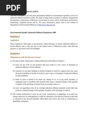 In exercise of the powers conferred by sections 21, 24, 25 and 51 of the environmental quality act 1974 act 127, the minister, after consultation with the environmental quality council, makes the following regulations: What are the environmental quality regulations for effluent? In exercise of the powers conferred by sections 21, 24, 25 and 51 of the environmental quality act 1974 act 127, the minister, after consultation with the environmental quality council, makes the following regulations: Short title of regulatory provision notes 3 application • applicable to any premises which discharge sewage onto or into any soil, or into any inland waters or malaysian waters, other than any housing or commercial And (b) the provisions of the re' conditions of sewage d] and (iv) of the second 31 december 2019.